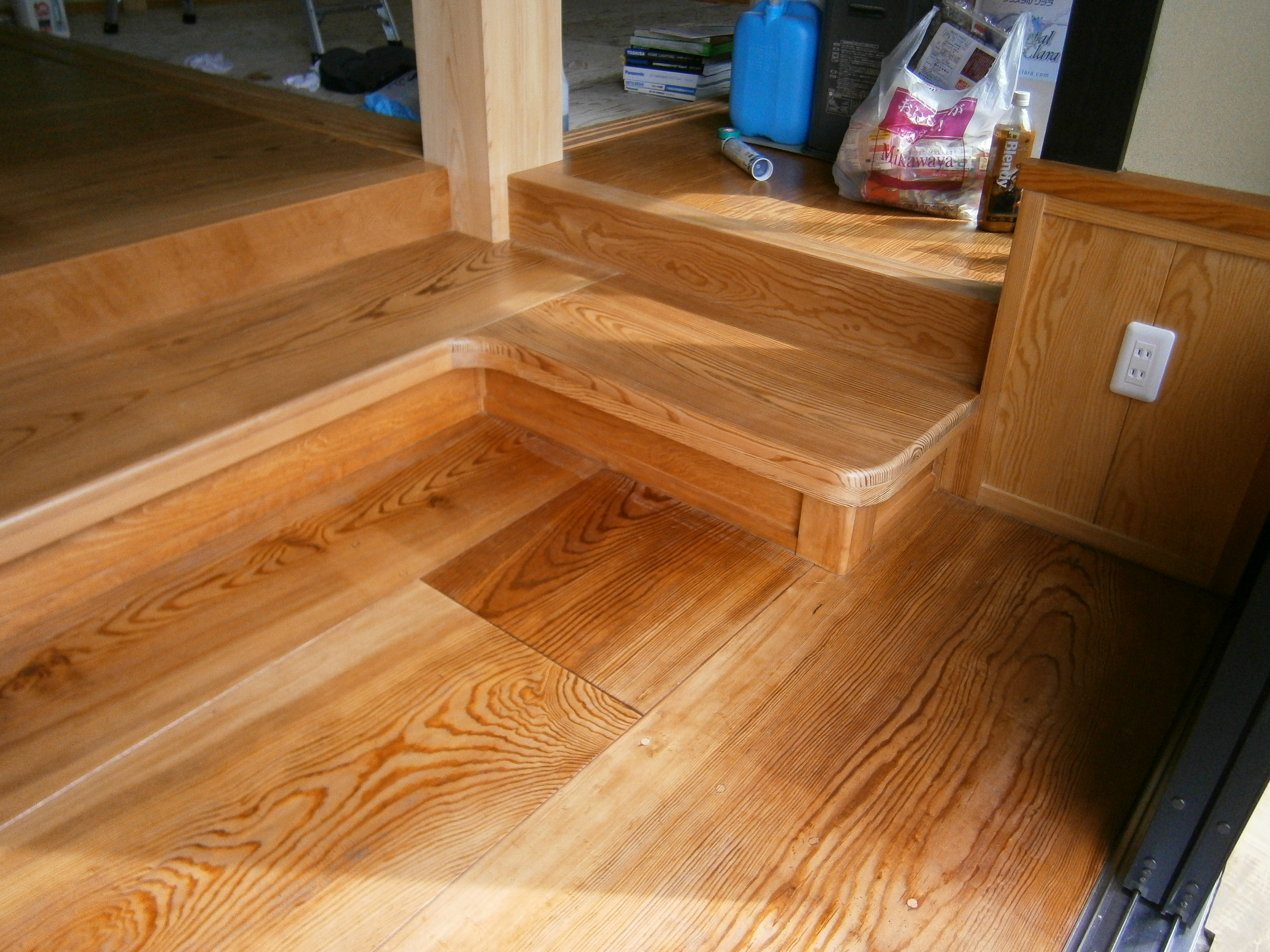 旧母屋の浜縁(100年物)を新築住宅(グリーン建築)に取り付けました。古材ですがいい仕事がしてある為に、返って新鮮味が有りおばあちゃんが絶賛してくれました。引き出し付きでここには普段使わないはき物(神事ごとの下駄、靴など)を収納するように出来ています。先人の知得ですね~