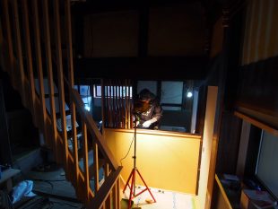 手前は堀こたつ式の囲炉裏、奥手左は仕込みの江州タンス、玄関は連子戸を利用しての片引き戸に雨戸を。